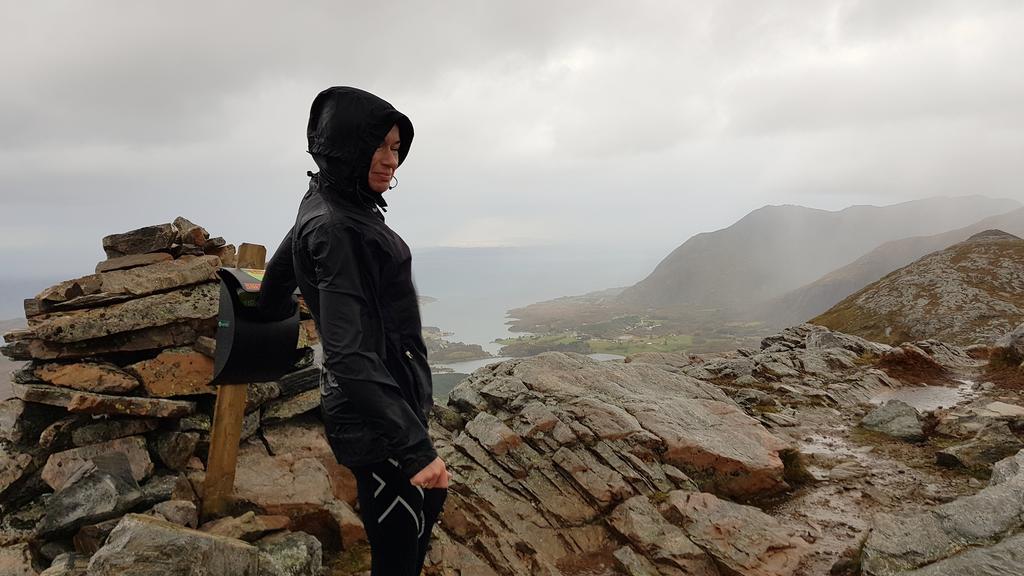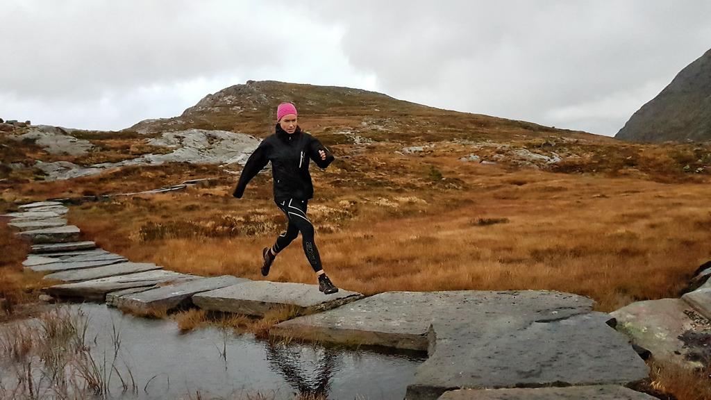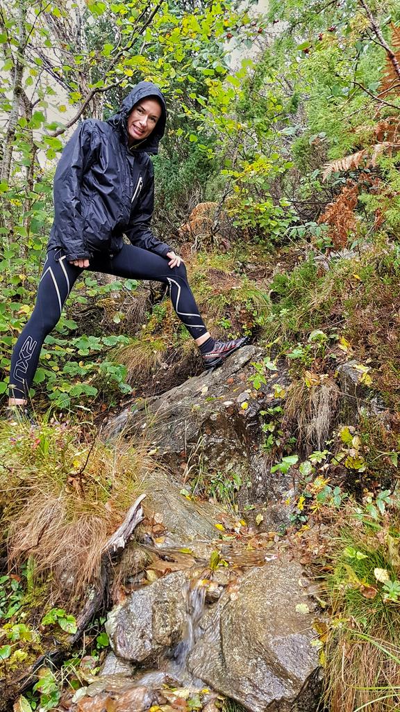 bevege meg. Samboer måtte gå foran og blokkere for vinden slik at jeg kunne begynne å bevege meg. Her ble det påtvunget ansiktspeeling; leppene svulmet opp, fikk en frisk rødfarge pga alle nålestikkene fra regndråpene, mindre lekkert å få samme behandling rett inn på øynene. Skulle hatt briller …eller kanskje ikke. Samboeren min famlet tidvis i blinde nedover, pga mild dugging og konstant regn på sine briller. Egentlig helt utrolig at alt gikk bra, bortsett fra noen gjørmefall og vrikket lillefinger. Da vi kom oss litt lengre ned var det en fryd å løpe på de fine steinhellene. En tur som virkelig kan anbefales hvis dere skulle være i området en gang.