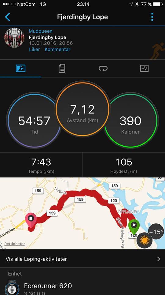 …må dog si at skuffelsen sto litt i taket da jeg endelig kom meg avgårde. Antrekket besto av thermaltoppen til Skins, dressen jeg skal løpe i Wolverhampton med, en mellomjakke, en goretexjakke, ørevarmere, buff, ullvotter med vindvotter utenpå og ullsokker + løpesekken min med frokost, lunsj og skiftetøy i. Puh…bare å bevege seg er en treningsøkt i seg selv, og resultatet – alt for høy puls (igjen) på selv latterlig lavt tempo. Men nå skal det jo sies at med 25 minusgrader så er det visst tillatt med lavere tempo og man skal visst oppnå ok treningseffekt likevel. Garmin bekrefter dette og gir meg en 4,1 i treningseffekt da økten er ferdig.