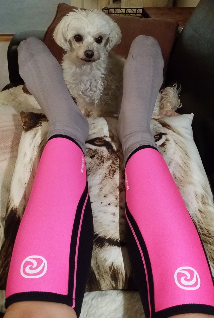 Etter harde løp eller treningsøkter er det godt å ligge i sofaen med kompresjons «calves» på, føler bena restitueres fortere da. Rebhand sine varmer godt på leggene. Når en i tillegg har en liten hund på toppen som varmepute, blir det perfekt.