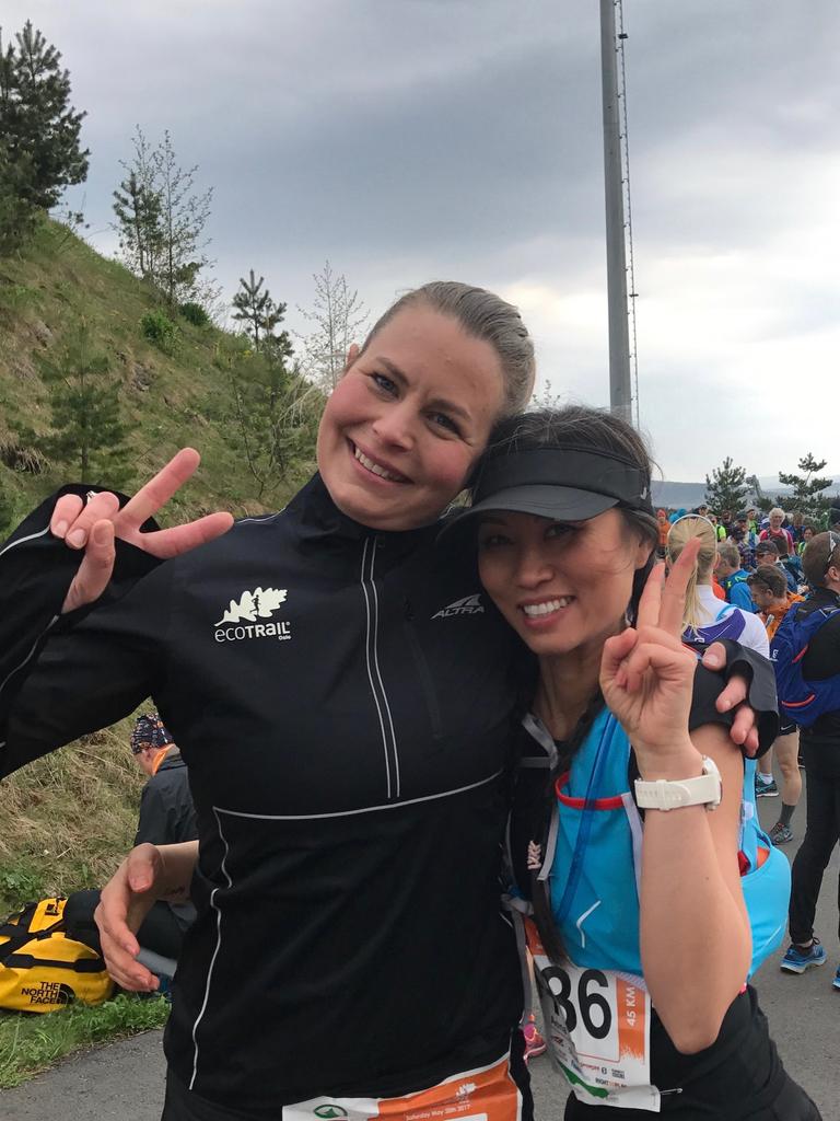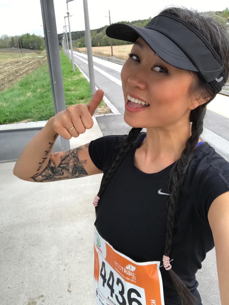 Toget kom. Jeg gikk ombord. Hentet frem mobilen. På Instagram så jeg hashtaggen “Ecotrail” overalt. Da gikk det opp for meg at jeg skulle ut på mitt lengste løp noensinne. Selvsagt var jeg klar over det hele tiden, men det var jo først nå det skulle skje, det var nå jeg skulle debutere på maraton og ultradistanse, sånn på ordentlig. Det var ikke en drøm eller en tanke lenger, nå skulle jeg virkelig realisere det jeg ville. Det ilte en forventningsfull kribling gjennom hele kroppen. Jeg var utrolig spent og nysgjerrig på dette løpet. Jeg var spent på hvordan kroppen og beina kom til takle en såpass lang hardøkt i terreng. Jeg var nysgjerrig på om dette var noe jeg kom til å fortsette med, og ikke minst om jeg klarte å gjennomføre løpet. Det lengste jeg hadde løpt var 23 km på asfalt, nå skulle jeg doble distansen i en løype som var helt utenfor min komfortsone. GALSKAP! Som min svigermor pleier å si: “Lille gule gærne svigerdattera mi!”. Ja, for jeg elsker jo å være gul og gal!
