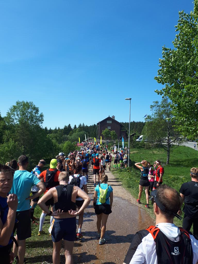 Løpsdagen kom! Jeg sov dårlig sisten natten, veldig urolig og nervøs. Det faktum at solen stekte og temperaturen viste nesten 30 grader gjorde ikke nervene mindre. Var det forsvarlig for meg å løpe i denne varmen? Jeg er ikke av de som takler varme så godt, spesielt ikke når jeg skal løpe. Varmen denne dagen skremte meg litt. Frokosten var vanskelig å få ned, men kaffen smakte godt. I det jeg fant frem startnummeret og pakket løpesekken for en hel dag i marka, så endret følelsene seg noe fra nervøs gruing til forventningsfull spenning. Jeg var klar!