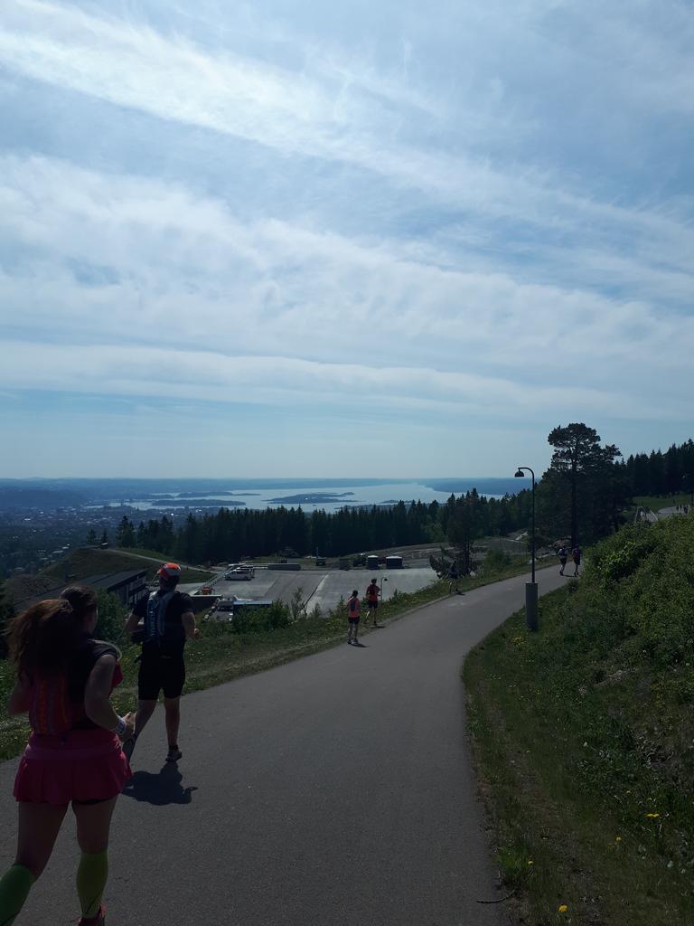 Første kilometer er nedoverbakke. Enkel start med nydelig utsikt over Oslo og Holmenkollen. Jeg følte meg så glad og takknemlig for jeg har mulighet til å være med på et løp som dette. Mange bekjentskaper har jeg fått av løpere, og jeg er heldig som får være med på disse opplevelsene.