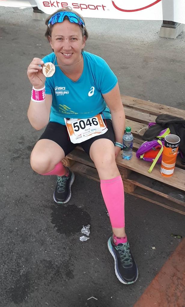Når det går opp for meg blir det litt for mye følelser. Jeg er sliten, varm, og har vondt i hele kroppen. Dette har jeg drømt om hele det siste året, og jeg har så mange ganger sett for meg hvordan det skulle bli å løpe i mål etter 5 lange mil. Jeg trodde jeg skulle juble høyt og gråte av glede. I stedet løper jeg stille i mål, stopper klokken, får medaljen og synker ned på en pall. Jeg får servert kald Farris av mannen min og er helt tom, bortsett fra mestringsfølelsen. Den fyller både kroppen og hodet, og det er bare helt ubeskrivelig magisk og fantastisk.