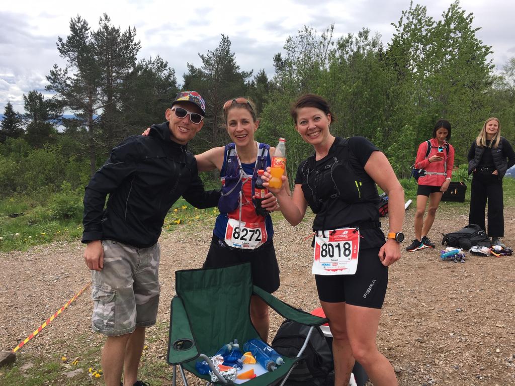 I Sørkedalen møtes vi av et hyl som jeg er sikker på at kan høres i hele Oslo og Bærum. Da vet alle som kjenner #høgepålivet Nina at det er henne. Hun er ikke sjenert, og vi føler oss heldige som kan løpe inn til matstasjonen under hennes hyllest :) Hun har også med seg solo, sjokolade og potetgull. Runar står der med alt han har med seg, og bordene til Ecotrail bugner av godsaker. Alt vi har i vesten er overflødig. Den blir ikke noe særlig lettere på turen. Selv om det er superkos å ta seg litt tid med supporterne våre var vi fast bestemt på å bruke mindre tid på stasjonene i år enn i fjor så etter et passe kort stopp satte vi kursen mot Fossum. Det begynner med en grei stigning hvor man tror at man når toppen uten å nå toppen opp til flere ganger. Den mila mellom Sørkedalen og Fossum tar litt tid for her er det også mye terreng. Pingla ligger bakerst og passer på at alt går greit for seg ;)