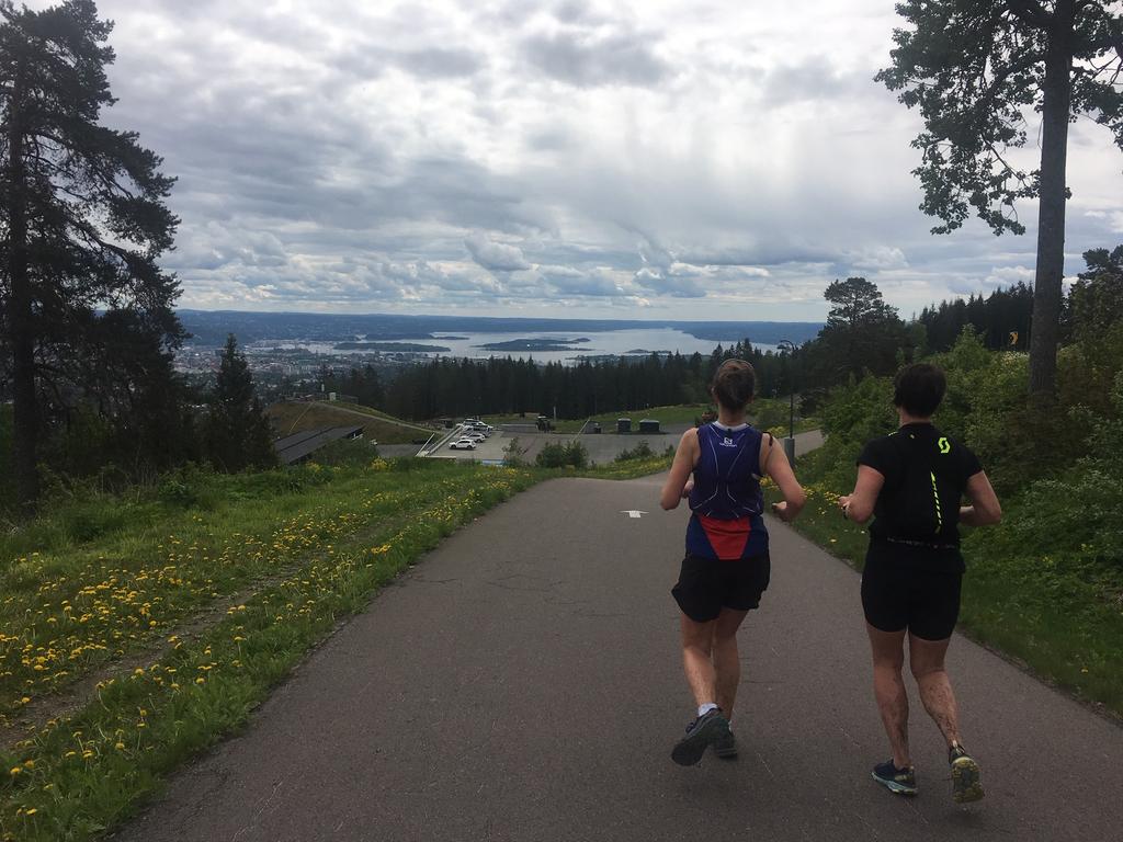 På 30 km punktet på Frognerseteren blir vi møtt av Runar, mannen til Laura. Runar er proffesjonell ultraløper, og han KAN support. Makan til opptur skal man lete lenger etter. Laura husket fra i fjor hvor glad Sissel og jeg er i iskald solo og appelsin, så der sto Runar med solo, oppskåret appelsin og melon. Det er utrolig mye godt på matstasjonene til Ecotrail også, men det at noen er der og supporter oss litt ekstra på en så lang tur føles ekstra fantastisk. Det smakte helt vannvittig godt før vi visste at det bare skulle gå oppover og oppover i Holmenkollen området.
