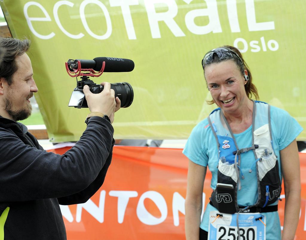 Fikk et kamera i ansiktet rett etter målgang. Beskrivelsen rant ut av meg. Tror egentlig ikke personen stilte meg et eneste spørsmål. Litt sliten, men ser på øynene mine at jeg er ganske så fornøyd med den positive opplevelsen av gjennomføringen. Foto: Jarle Mordal