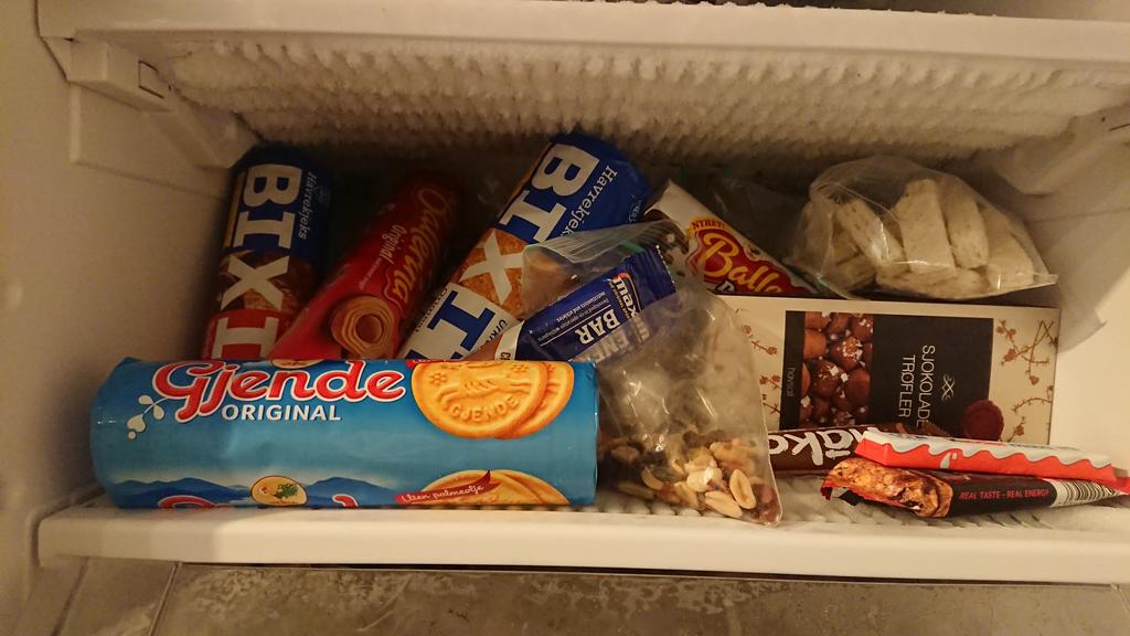 De siste ukene har fryseren min vært fylt med alt mulig rart som vanligvis ikke er å finne i en fryser. Forskjellige protein og energibarer, nøtter, de fleste sjokolader man finner i dagligvarebutikken (og noen litt mer eksklusive), samtlige av Sætres kjeksvarianter, fleskesvor og mere til. For det holder ikke at maten er energitett når man legger ut på tur i temperaturer ned mot -40 kuldegrader. Da må det også være matvarer som kan spises selv om de er frosne. Alt av energi og proteinbarer har jeg strøket fra listen. Det samme med sjokolade som New Energy og Snickers. Det krever jo mer energi å tygge en frossen proteinbar eller en stivfrossen Snickers enn det gir næring. Gullvaffler, kvikk lunsj, kjeks, nøtteblanding med tørket frukt og sjokolade, sjokoladetrøfler og fleskesvor derimot, det er mat som fint kan spises rett fra en fryser som holder -20 grader.