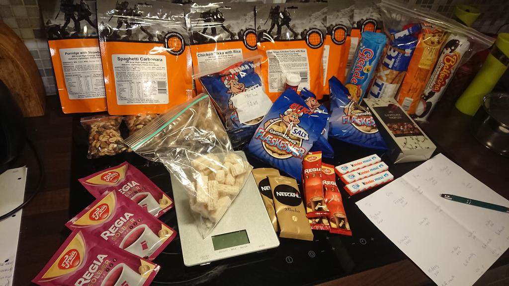 Jeg har valgt å ta med frysetørket mat fra Expedition Food til frokost og middag. Grunnen er at de har porsjoner på 800 kilokalorier, veier lite og har et godt utvalg av retter å velge mellom. Da har jeg sluppet unna mye styr med å lage mat og tørke selv, samtidig som jeg vet nøyaktig hva jeg får i meg av næring per porsjon. Til frokost vil det gå i havregrøt med ekstra mye næring. Av middagsretter har jeg valgt meg ut Spagetti Bolognese, Chicken Tikka med ris, Thai Green Chicken curry, Spagetti Carbonara og Kyllinggryte med ris og grønnsaker. Og på den måten har jeg allerede dekket 1600 av de 3000 kaloriene som jeg skal ha i meg hver dag.
