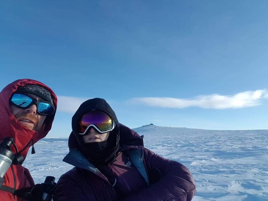 Jeg fikk følge av David det siste stykket opp mot toppen, der blåste det friskt og selv om det var sol og skyfri himmel merket jeg at temperaturen gikk drastisk ned oppe på toppen og jeg ble nødt til å ta på meg et ekstra lag på overkroppen. David hjalp meg med å få på meg jakka, det er nemlig ikke super enkelt å ta på seg jakke når det blåser friskt og man har votter på hendene og så tok vi oss tid til å nyte den fantastiske utsikten et øyeblikk og å ta en super kul selfie sammen. Dette er noe av det jeg digger med ultraløping. Det at man kan ta seg tid til litt moro og at man hjelper de man konkurrerer mot og drar hverandre fremover.