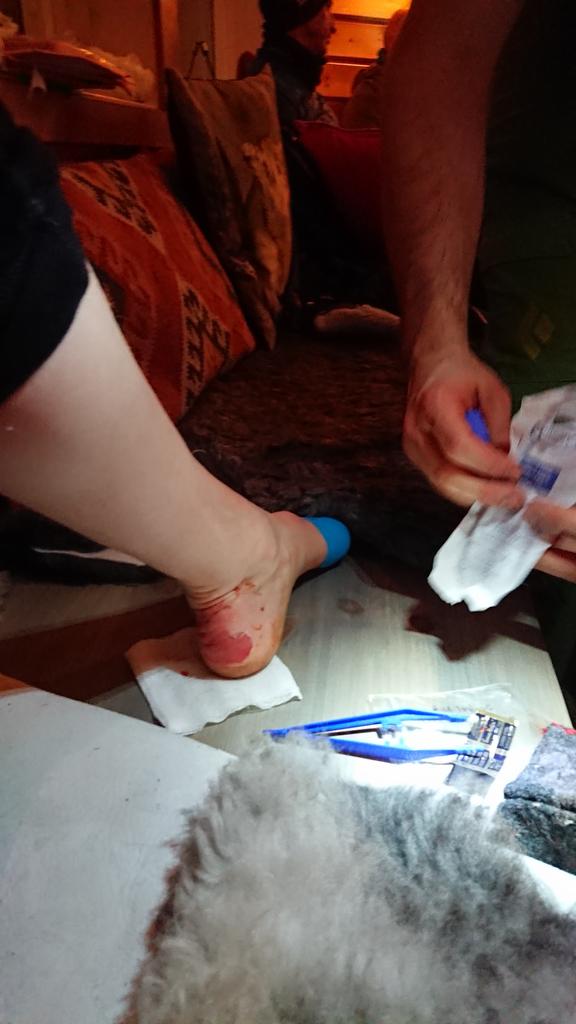 Jeg kom i mål som dame nummer 1 og nummer 5 totalt og ble ønsket velkommen i en varm peisstue hvor klær og utstyr fikk tørke mens jeg spiste og fikk hjelp til å lege gnagsårene mine. Og ja, skalpellen ble brukt. Og mens kirurg Tim gjorde et realt arbeid for å plastre meg sammen mens jeg hylte og tårene rant, lovet jeg meg selv å aldri noen gang ta på meg disse trugene igjen. Jeg skulle fullføre løpet uten, om jeg så ble nødt til å traske med snø opp til knærne de resterende 125 kilometerne til Jokkmokk.