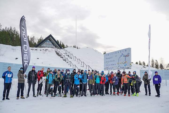 Da jeg endelig hadde klart å krabbe ned fra hemsen var neste prosjekt å få i seg frokost. Den søte havregrøten som jeg hadde elsket de første 3 dagene vokste nå i munnen min og fikk meg til å brekke meg. Søtt var det siste jeg hadde lyst på nå. «Do anyone want Chicken Tikka?» En av de belgiske guttene jobbet hardt med å få tømt sekken for så mye som mulig og delte ut overskuddsmat. «Yes please!», en salt og litt sterk Tikka fra Expedition food fristet tusen ganger mer enn den søte grøten jeg prøvde å få i meg. Rundt bordet var løperne i full gang med å dele broderlig restene av snacks, mat og pulver til varm drikke. Ingen ønsket å bære med seg mer enn nødvendig det siste stykket inn til mål. Noen som har lyst til å bli kvitt litt Paracet og gjerne Ibux også? Nå var beina mine så vonde at jeg ikke brydde meg en døyt om regelen jeg har om å aldri bruke Ibux under løp (google Ibux og Rabdomyolyse hvis du lurer på hvorfor). Det var helt uaktuelt å bryte løpet nå. Jeg skulle i mål om jeg så måtte krabbe de siste 15 kilometerne. Jeg fikk i meg et gram Paracet og 400mg Ibux og så begynte jeg sakte å bevege meg ned mot startstreken. De andre hadde samlet seg foran skiltet hvor det stod at vi var på polarsirkelen for å ta et gruppebilde. Jeg kom ikke frem i tide, så jeg fikk ikke vært med på bildet. Det sier kanskje litt om hvilken fart jeg beveget meg i på dette tidspunktet.