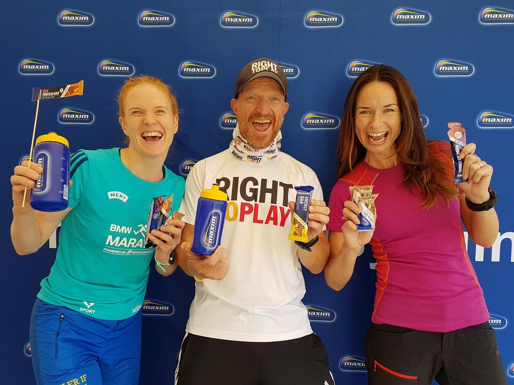 Tre engasjerte ambassadører tar jobben for Oslo Maraton veldig seriøst ;) Aktiv reklamering for en av sponsorene Maxim. Veldig kjekt å treffe disse positive personene «live». Fra venstre; Abelone, Stig og meg.