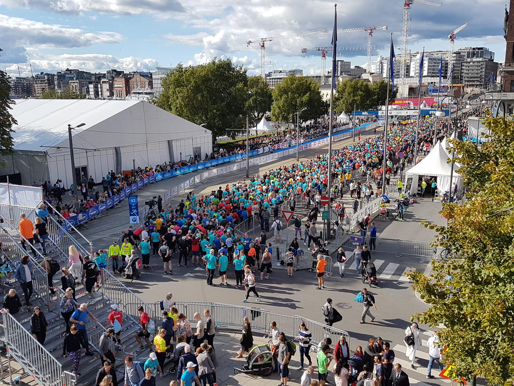 Her sees siste pulje ut på halvmaraton. Været og temperaturen var perfekt denne dagen. Jeg og en kollega spiser lunsj på et tak og venter på 10 km senere på dagen.