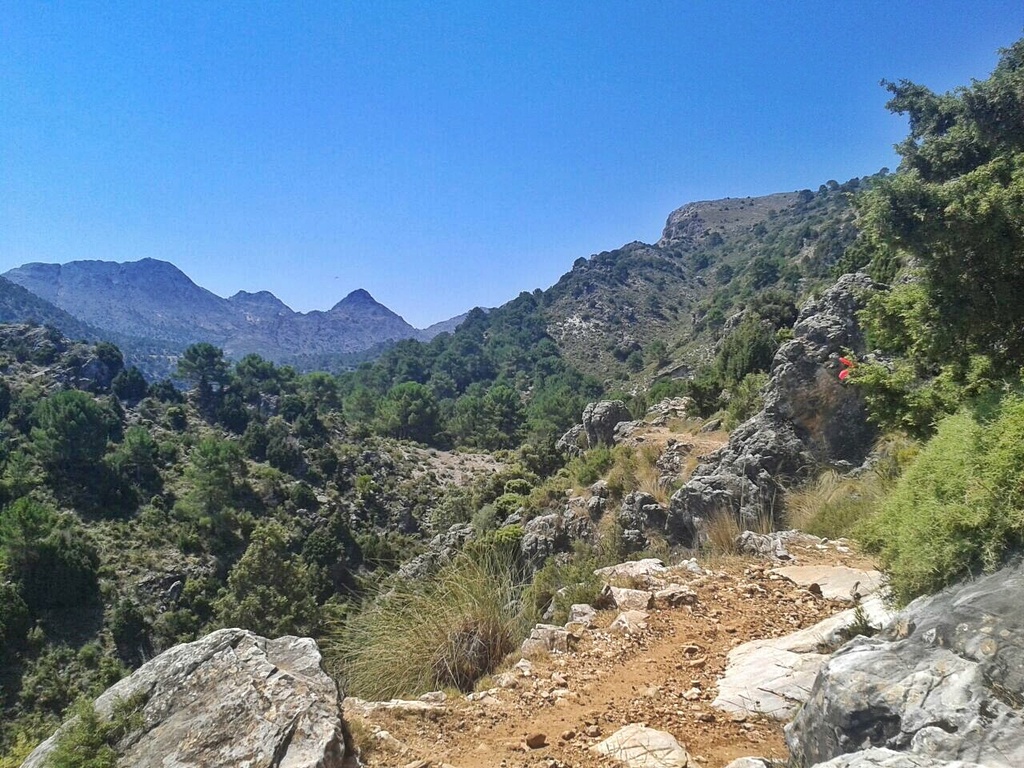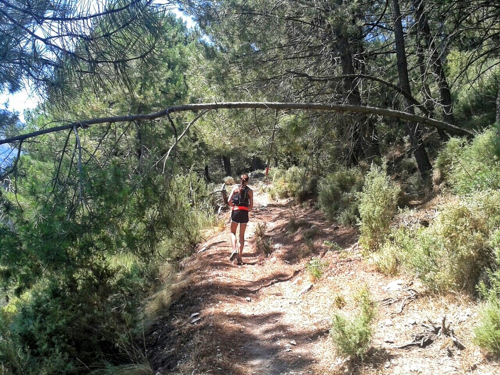 Da vi også begynte å se dyr rundt oss, fikk turen enda en ny dimensjon. Vi møtte på flere villgeiter; Ibex, som ikke ble oppdaget før de spratt opp fjellsidene da vi passerte. Så for meg at jeg skulle kunne løpe slik en dag, FOR en kondis de har! 50 meter lengre fremme så jeg plutselig et villsvin, som krysset stien. Jeg ble en smule usikker på hva jeg skulle gjøre. Villsvin skal man være forsiktig med, aldri gå imellom en mor og hennes barn og egentlig aldri kom for nær dem. Jeg visste bare ikke hva som regnes som «for nær». Videre på turen dukket plutselig 4 hester opp på stien foran oss. Instruktøren mente det var villhester. Jeg er usikker på om det finnes ville hester i Spania, men de gikk i hvert fall uten menneskelig følge. De travet foran oss et stykke oppover i skogen.