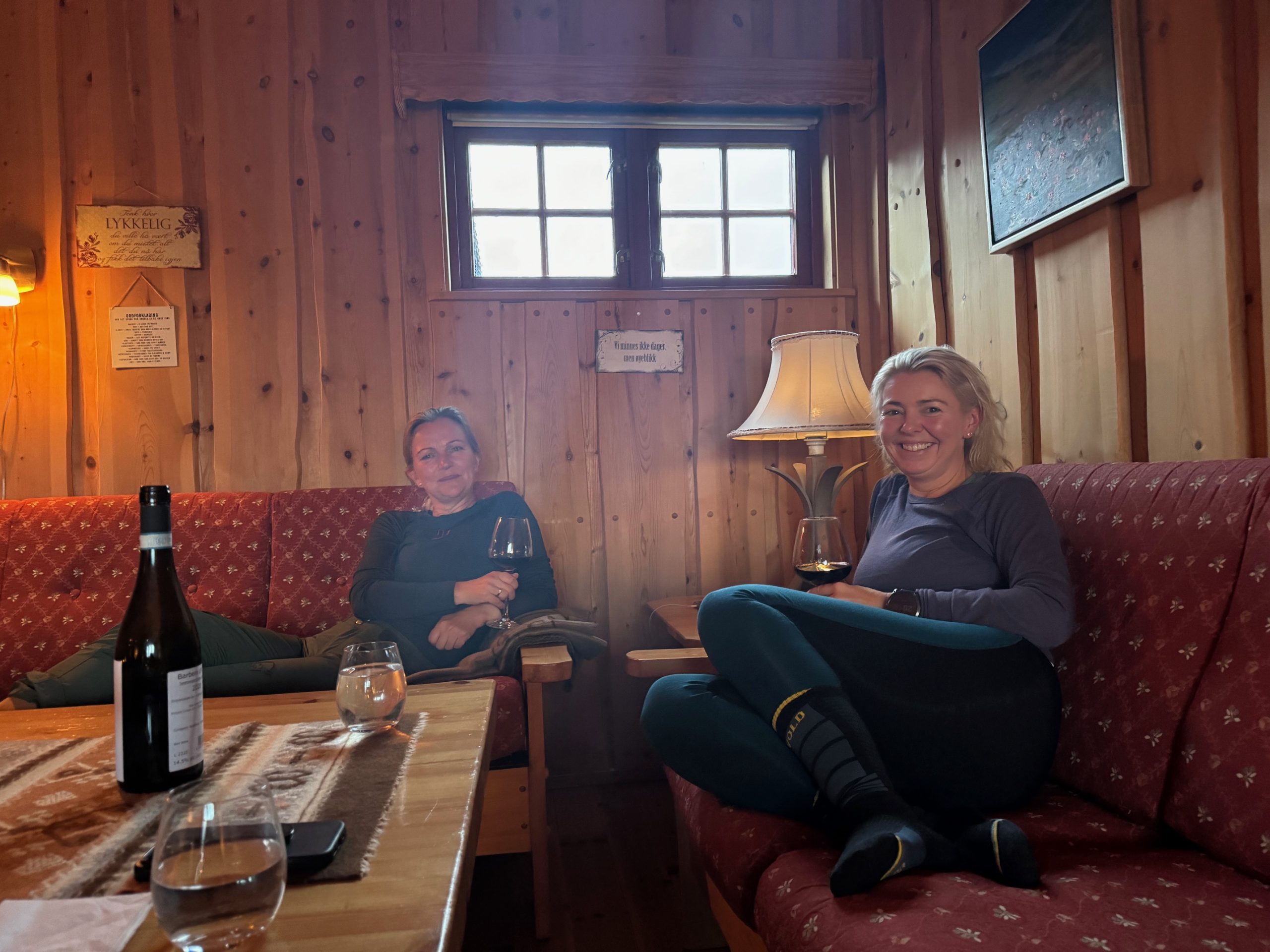 Jeg passet på å gå inn i spisesalen for å fylle vannkaraflene. Var jo fortsatt svært bevisst på at den lengste etappen ventet neste dag med 40 km. I spisesalen satt de mannlige gjestene og spiste middag (La oss kalle de gutta, de var bare litt eldre enn oss) Som seg hør og bør spør vi selvfølgelig hverandre hvordan dagens tur har vært, hvor den har gått osv. Raskt finner vi ut at i tillegg til fjell og natur deler noen av oss løpeinteressen. Det tok minst et kvarter å fylle på de vannkaraflene. Tilbake i sofaen i peisestuen fikk vi etter hvert selskap av den gjengen – noe som ble veldig morsomt og hyggelig.