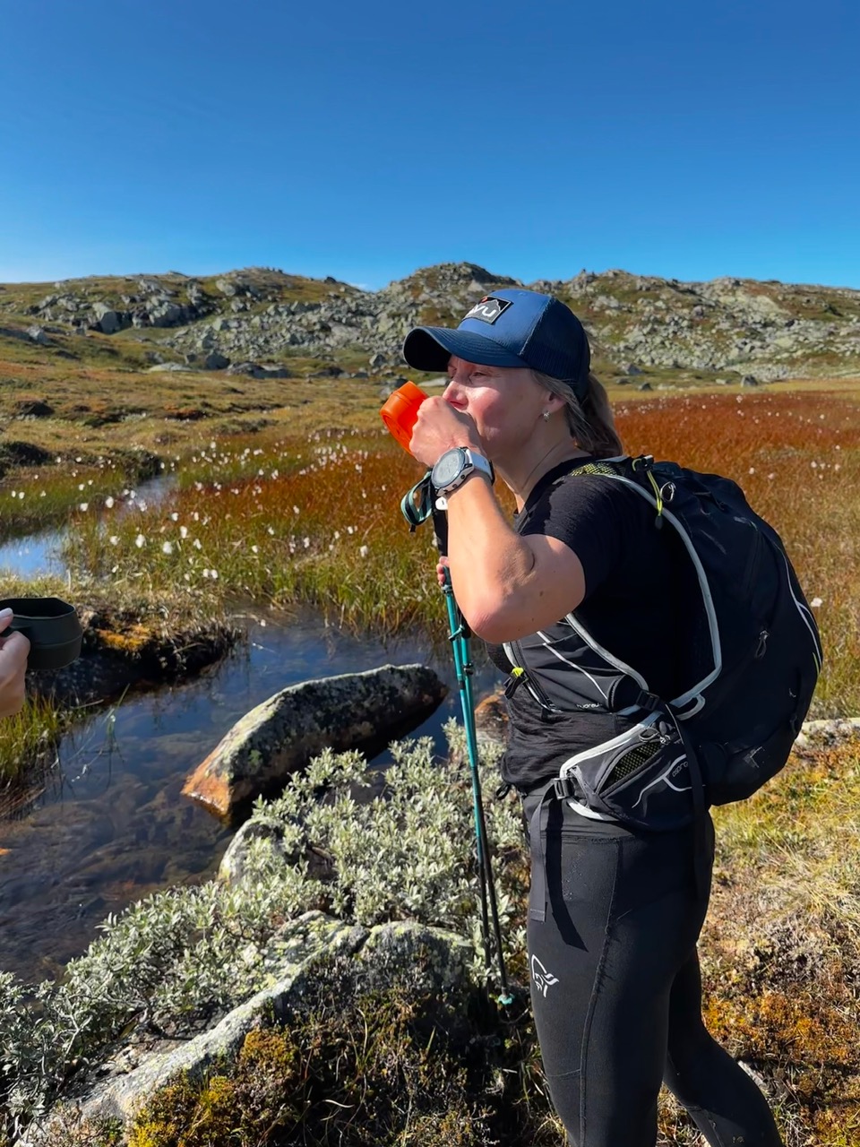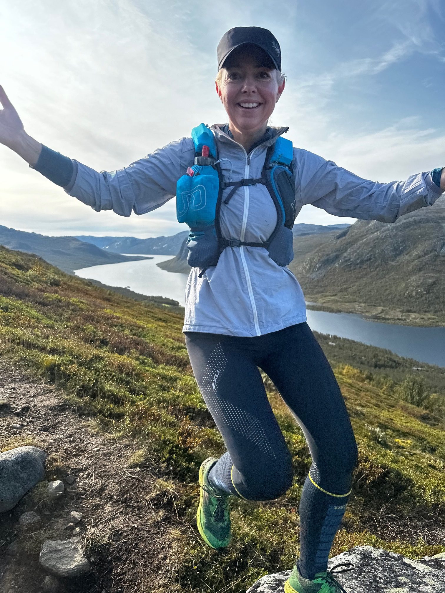 Vi koste oss på veien. Både på dag 2 og 3 tok vi oss tid til å spise matpakke sittende et par ganger. Vanligvis kan vi ikke det for da blir vi raskt for kalde. Vi er jo kledd for å løpe, altså ikke altfor mange lag selv i kjøligere vær. Sekken inneholder som alltid viktige klær som regnjakke, regnbukse og dunjakke. Alt i lettvekts materiale som tar liten plass i sekken. Ullstilongs, trøye, hansker/pannebånd/buff, et sett klær til kveldene, sokker, toalettsaker og ikke minst liker jeg å ha med flip-flop siden det ganske ofte er utedo. Sekken min er alltid full, og da er den ca 4,5 kg.