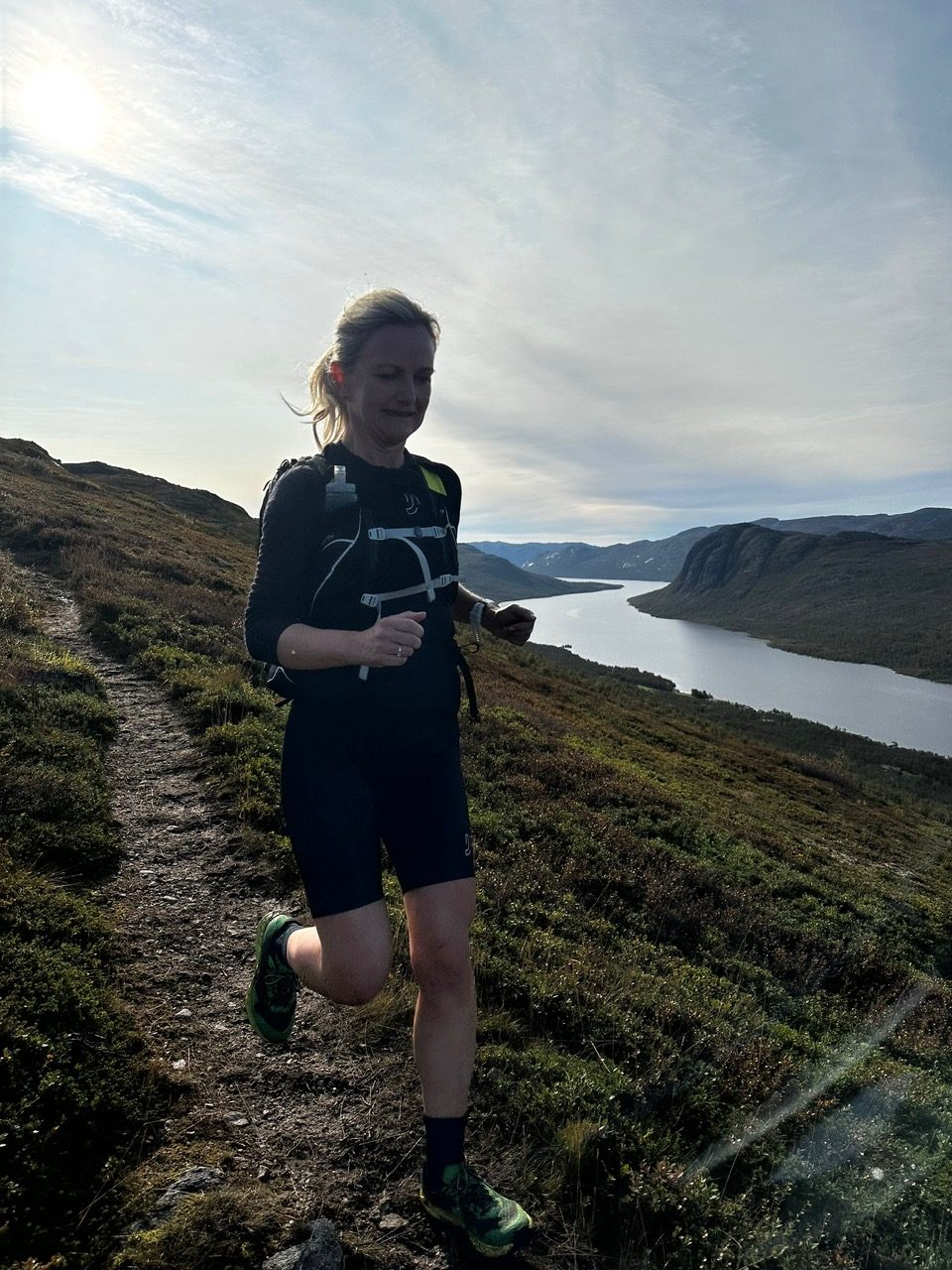 Eneste ulempen med høy temperatur kombinert med vått og gjørmete underlag er at det stort sett blir blemmefest for føttene mine, uansett hvilke sokker eller sko jeg har. Jeg har løpt langt i normal temperatur og ikke fått en blemme eller gnagsår, men de gangene det har vært varmt – da melder blemmene seg. Det gjorde de også her. Jeg fikk noen på dag 2. De poppet og plastret jeg før vi satt ut på siste etappe. Jeg kjente at jeg levde for å si det sånn, men jeg er god til å ignorere. Noen nestensnublinger (les slå tåa i steinen) flere ganger, og et par ganger i bakken ble det denne dagen. Jeg så ut som en feier når jeg kom til Kalhovd siden jeg hadde valgt shorts.