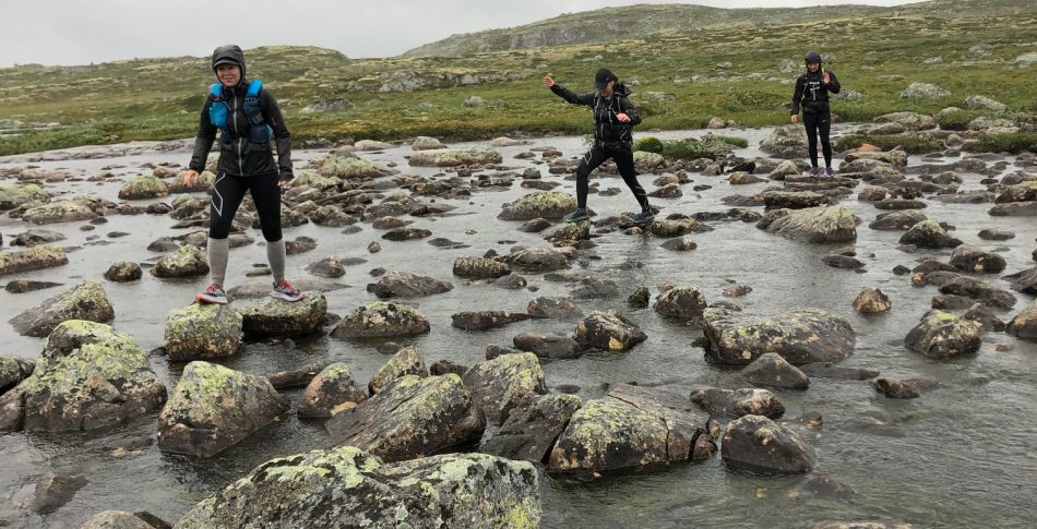 Vi frøs når vi satte i gang, men fant fort varmen. Vi var aldri tørre på føttene da for det var utallige bekker vi måtte vasse over og ikke minst myr. Etter en stund kom vi til et stryk hvor vi skjønte at vi i hvert fall måtte vade til knærne. Det var også ganske mye strøm. Hanne har vært mye på Hardangervidda både sommer og vinter med mannen sin og er vår «kjentkvinne», Sissel er tøff og trygg i situasjonen mens Silje og jeg måtte litt lenger ut av komfortsonen over disse strykene. Hanne gikk først. Silje, Sissel og jeg kom etter i armene på hverandre. Sissel fikk plutselig rollen som den trygge mora og Hanne den gode storesøsteren.