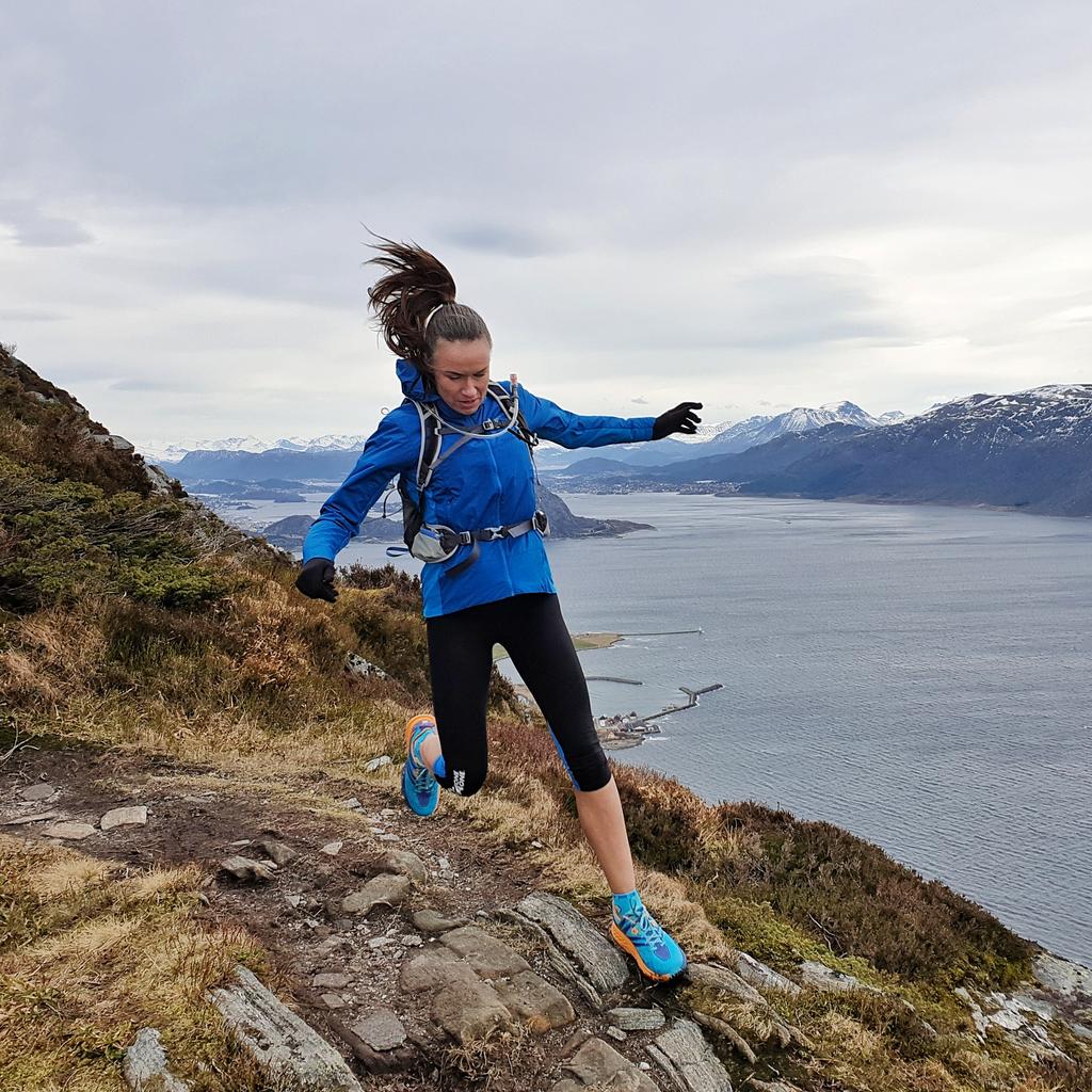 a) På denne turen på Godøyfjellet oppdaget jeg raskt at vi hadde en guttegjeng på 4 stykker bak oss. Jeg kjente hvordan konkurranseinstinktet snek seg gradvis mer frem. Målet ble å ikke la dem hente oss inn. Begynte etter hvert å fundere på om det er best å la seg jakte på eller om det faktisk er bedre å være den som jager. Jeg konkluderte med at begge alternativene har sine fordeler og ulemper. Pga noen «helt nødvendige» fotostopp, tok de oss igjen, kun en liten periode… Historien fortsetter under bilde b)