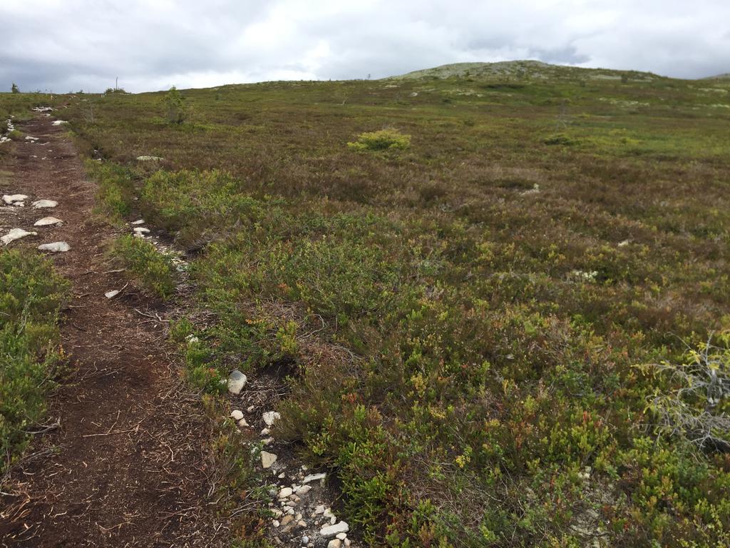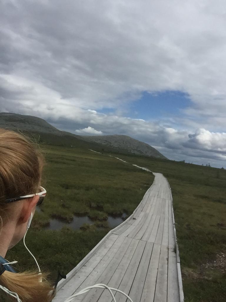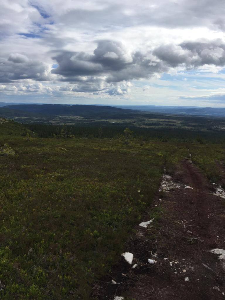 Det første som møter deg når du løper over startstreken er en lang bakke. Dette er helt klart den kjedeligste biten av Trysilrypa. Jeg ser for meg at mange nok har brent seg på at de har startet for hardt. Ikke bare er det en tøff oppoverbakke, det er også ganske kjedelige omgivelser. Men bare hold ut, for etter 800 meter med tung motbakke kommer man opp til der den fine delen av Trysilrypa starter. Og derifra er det bare vakker natur og fantastisk utsikt som venter deg. På trysilrypa kort løype blir det nå et stykke rett frem med jord og grusvei før man kommer til en myr hvor det er laget en sti av klopper sånn at man kan komme seg tørrskodd over. Når jeg kom hit smilte jeg fra øre til øre, for her er det vakkert! Lett å løpe her er det også.