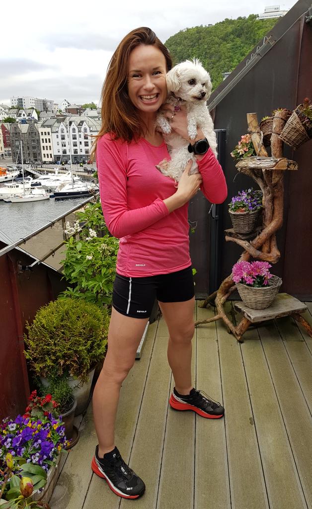 Tester ut Devold sin nye løpekolleksjon. Endte opp med en kortermet topp på løpet. Hunden Phiona er trent opp til å tåle lange terrengløp, kjekt selskap å ha med på løpeturer. Foto: @tbjx