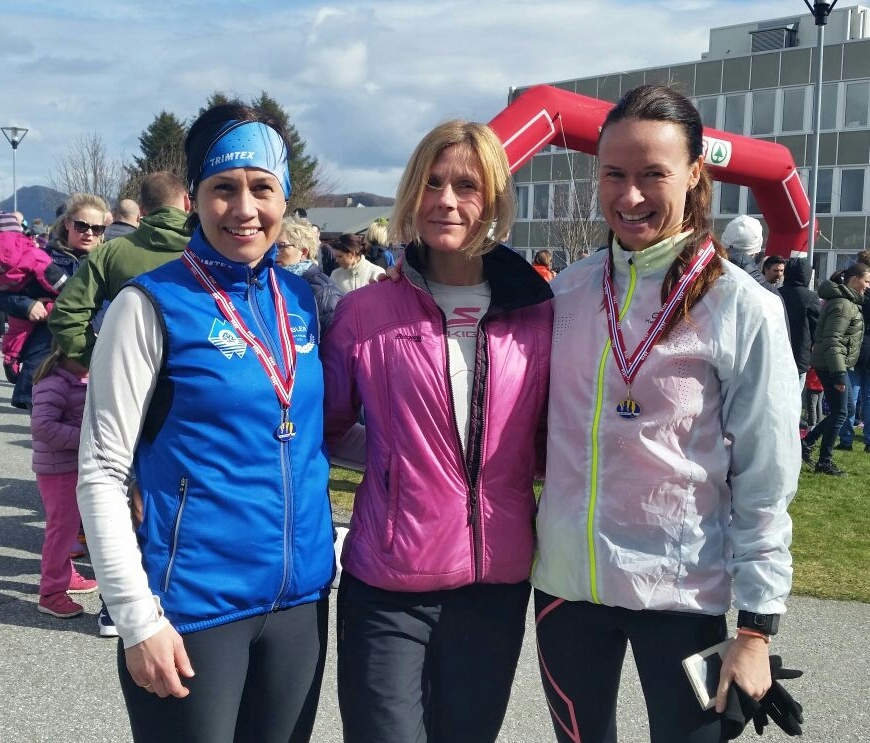 Min medløper Anne Berit Emblem til ventre, vinner Tonje Brande og jeg, ganske så fornøyd med at jeg ikke lot løpsnervnene hindre meg fra å delta.