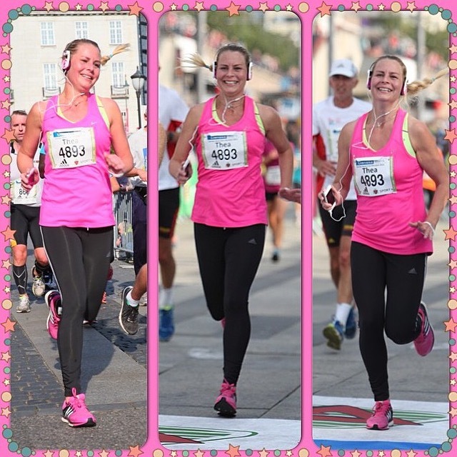Sommerens trening endret seg og min faste lørdagsrunde ble sakte, men sikkert forlenget. Løpet i Hønefoss gikk veldig bra og jeg var stolt som en hane der jeg løp min mil, pluss 5oo meter i rosa Svigersvinskjorte, som et offisielt medlem av familelaget. Dette var de som hadde tatt så varmt imot meg og mine to barn. Nå gledet meg virkelig til å stå på startstreken sammen med svigerfar i Oslo. Jeg og Tore løp sammen til Skøyen, der mistet vi hverandre, jeg nøyt virkelig løpet og opp Karl Johan hører jeg min svigermor rope «Heia Thea», det hjalp masse og jeg fikk ekstra krefter til en lang sluttspurt. Tore kom seirende ut av dette løpet, men løpegleden den vant jeg. Vel, i mål sto det en ting i hodet mitt: HALVMARATON neste år! Maraton derimot, DET skulle jeg aldri løpe!