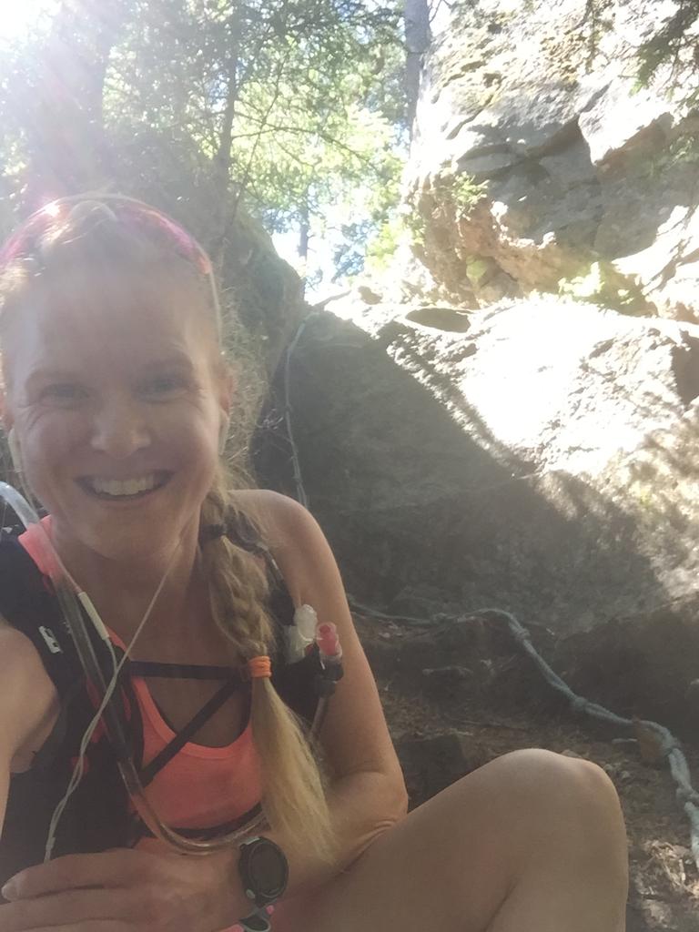 Her oppe tok jeg meg en matbit og nøt utsikten før jeg satte av sted nedover igjen. Jeg valgte en annen blå sti denne gangen og før jeg hadde løpt 20 meter stod jeg godt plantet med begge beina nede i et gjørmehull. Da jeg snudde litt på hodet oppdaget jeg at stien jeg trodde jeg fulgte lå sånn ca 2 meter til venstre for der jeg nå stod med begge beina godt plantet i gjørma.