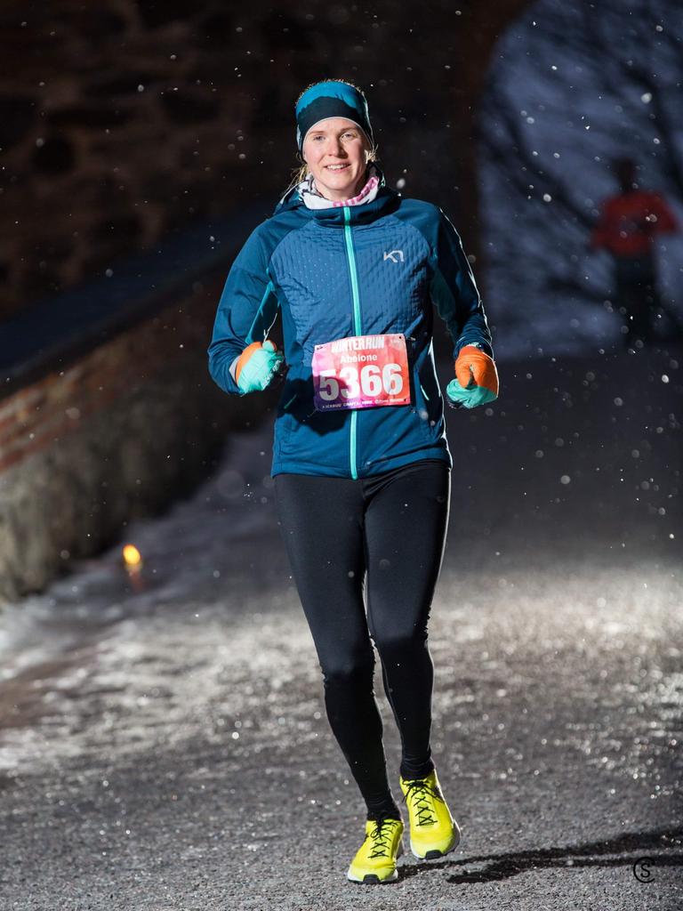 Etter de første 100 meterne ble det bra med plass igjen. Jeg hang meg på en av de andre damene jeg hadde sett kom til å løpe raskt og selv om hun hadde litt forsprang tok jeg henne igjen litt etter litt. Jeg hadde regnet meg frem til at jeg lå som dame nummer 3 eller 4 så motivasjonen for å ta igjen damen foran meg var stor. Tempoet var ikke så verst, men det var ikke så lett å få en god flyt for noen partier var det så glatt at selv Icebugsene slet med å få feste. Det var spesielt vanskelig i noen av de krappe og islagte svingene inne på festningen. Likevel tok jeg igjen damen foran meg omtrent halvveis i løpet. Noe som ikke var sånn kjempe bra, for jeg er helt klart en person som foretrekke å bli dratt fremfor å ligge foran og dra. Så da jeg hadde fått en liten luke til hun jeg hadde løpt forbi gikk tempoet mitt litt ned. Motivasjonen til å gi det lille ekstra forsvant for det var ingen foran meg som jeg kunne jakte på. Og samtidig var jeg akkurat der i løpet hvor man begynner å kjenne hvor vondt det faktisk gjør å løpe 5 kilometers løp. For det er noe av det vondeste jeg vet. Tro det eller ei, det kan være like smertefullt og slitsomt som å løpe et maraton. Forskjellen er bare at det går fortere over.