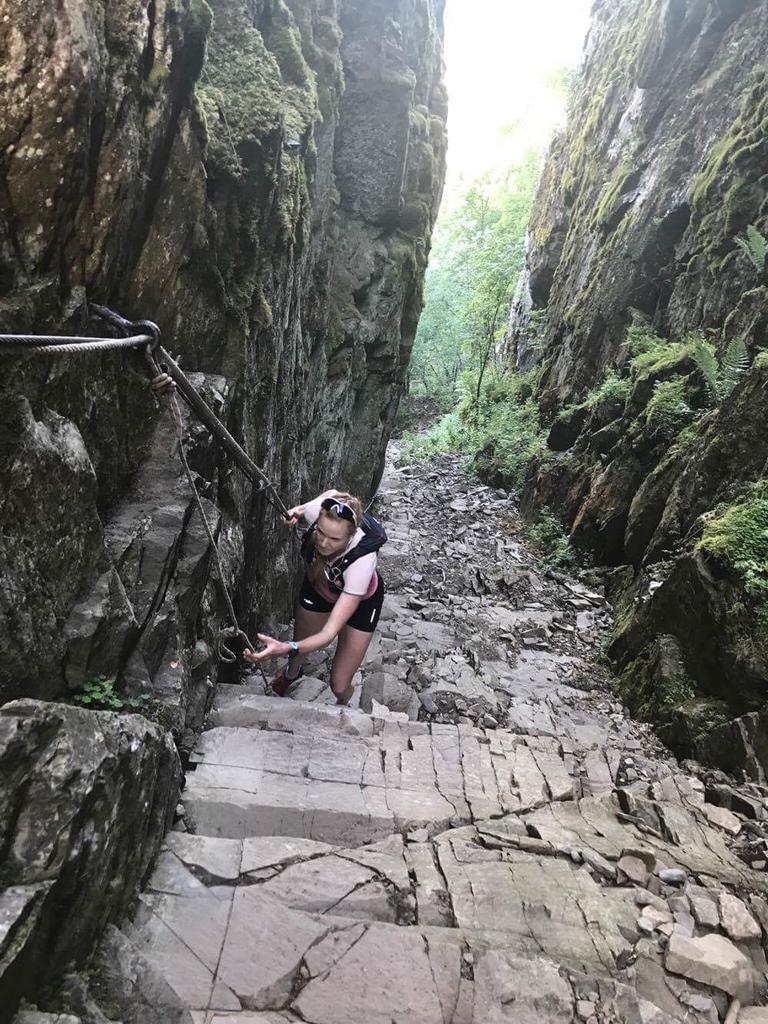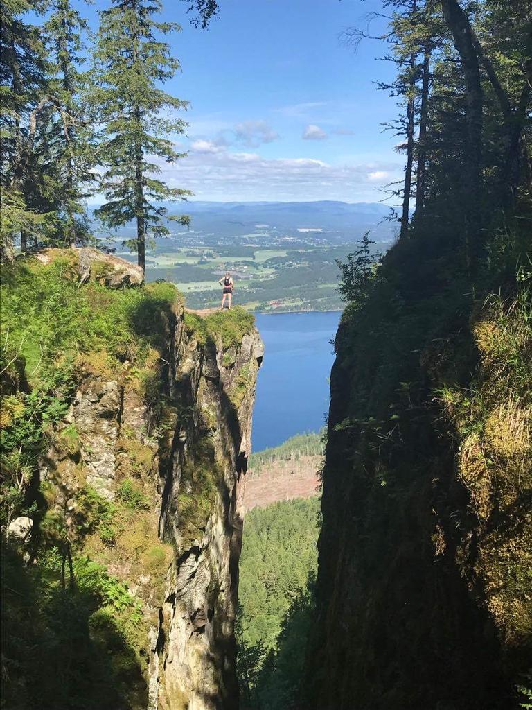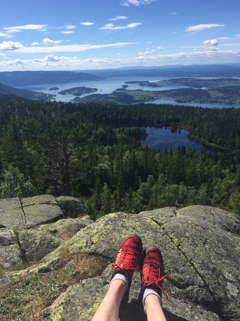 Turen startet nesten helt nede ved Steinsfjorden i Ringerike og vi fulgte en sti oppover mot Mørkonga. Det gikk i rolig tempo og jeg gledet meg til å komme frem til kløfta som etter en kort stund på sti ble synlig. Jeg var forberedt på at det kom til å være mye oppoverbakke til vi kom opp til toppen og lårene svei og svetten rant lenge før vi nådde frem til kløfta. Heldigvis for meg er det å gå i motbakke noe av det jeg liker aller best så turen opp var skikkelig moro for min del. Når vi nærmet oss Mørkgonga gikk stien over til å bli en steinrøys og der begynte også det bratteste partiet på turen. Jeg var veldig glad for at det var satt opp tau man kunne holde seg fast i når man gikk gjennom Mørkonga. For her føltes det mer ut som om jeg var på klatretur enn på løpetur og å miste balansen og ramle bakover fristet ikke i det hele tatt.