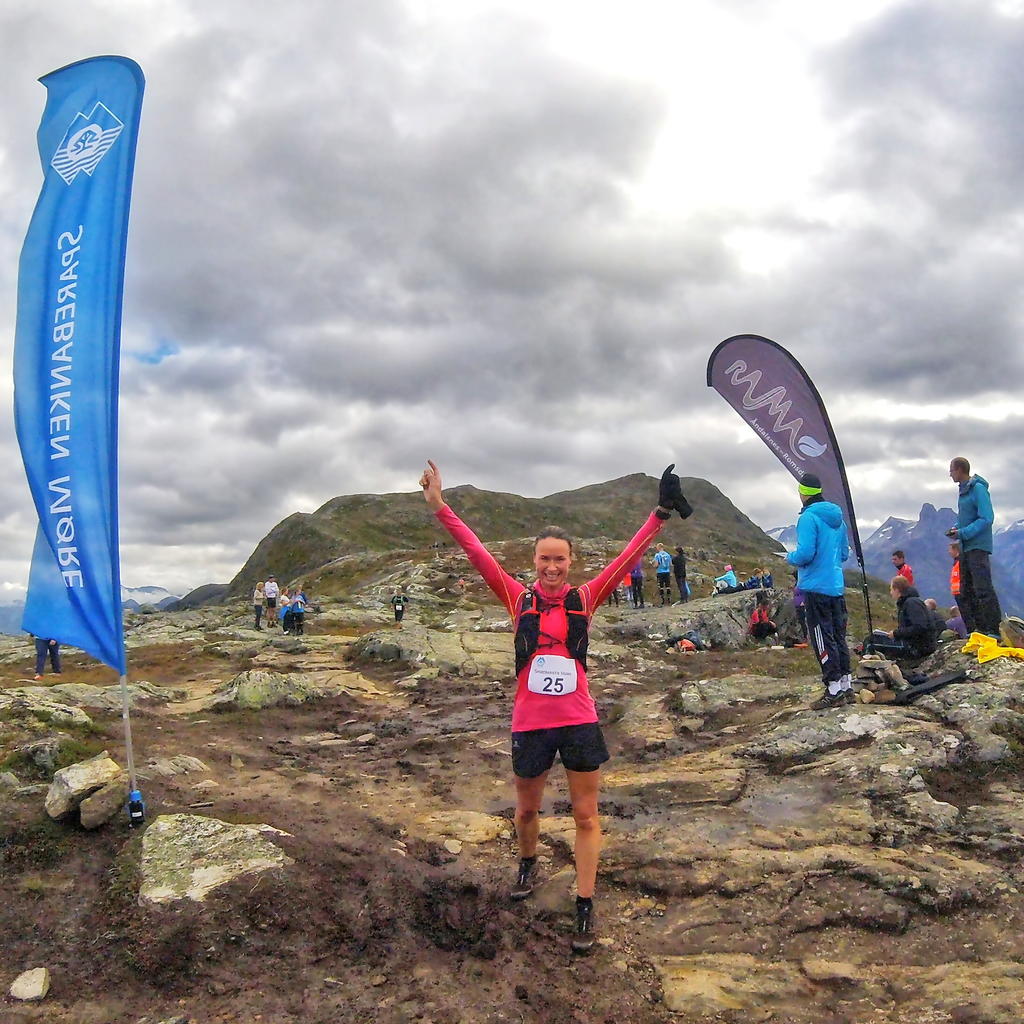 Jeg hadde en positiv følelse i dagene før løpet. Dagen begynte tidlig med buss fra Ålesund kl.07.15, til Åndalsnes. Kjente nervøsiteten komme krypende. Bib-nummer og møtested var i det flotte, nye bygget; Norsk Tindesenter. Det var mange spente løpere som satt å ventet der. Alle så veldig spreke og sterke ut, den antakelsen skulle vise seg å stemme. Jeg hadde erfart fra forrige løp, Stranda fjor trail race (race rapport kan leses her), at jeg måtte passe på å varme opp før start, så 4 km ble unnagjort før 91 deltakere startet i fint løpevær og behagelig temperatur fra Vengedalen. Løypen er 8.6 km lang, har 970 positive høydemeter og 700 negative meter. Det bar oppover i en skikkelig gjørmete bakke. Ingen poeng å stille med nyvaskete sko her. Folk raste forbi og forsvant oppover. Hode gikk rett inn i sitt negative modus (må jobbe mer med bevisste mentale strategier). Det gikk så langt at jeg vurderte der å da å slutte med alle former for konkurranseløping. Kanskje jeg burde innse at dette ikke er noe for meg, kanskje jeg bare er overoptimistisk og har en urealistisk drøm om å bli litt bra på dette? Jeg bestemte meg for å fortsette, om ikke annet for å se hvordan denne berømte ruten egentlig er. Etter det første gjørmete, bratte partiet gikk det over i noe slakere terreng før det igjen svingte bratt opp til eggen. Vi fikk mellomtiden på toppen. Jeg hadde brukt 59 minutter på å komme meg opp nesten 4 km og litt over 900 høydemeter. Det betydde at jeg da hadde 3.5 minutter på å forsere 4.6 km, ta igjen og komme i mål samtidig med første mann. Jeg hadde 13 minutter på meg til å ta igjen første kvinne i mål. Brukte litt tid på å forestille meg hvordan de to klarte å løpe opp det stykke jeg nettopp hadde lagt bak meg, skulle gjerne sett det på film.