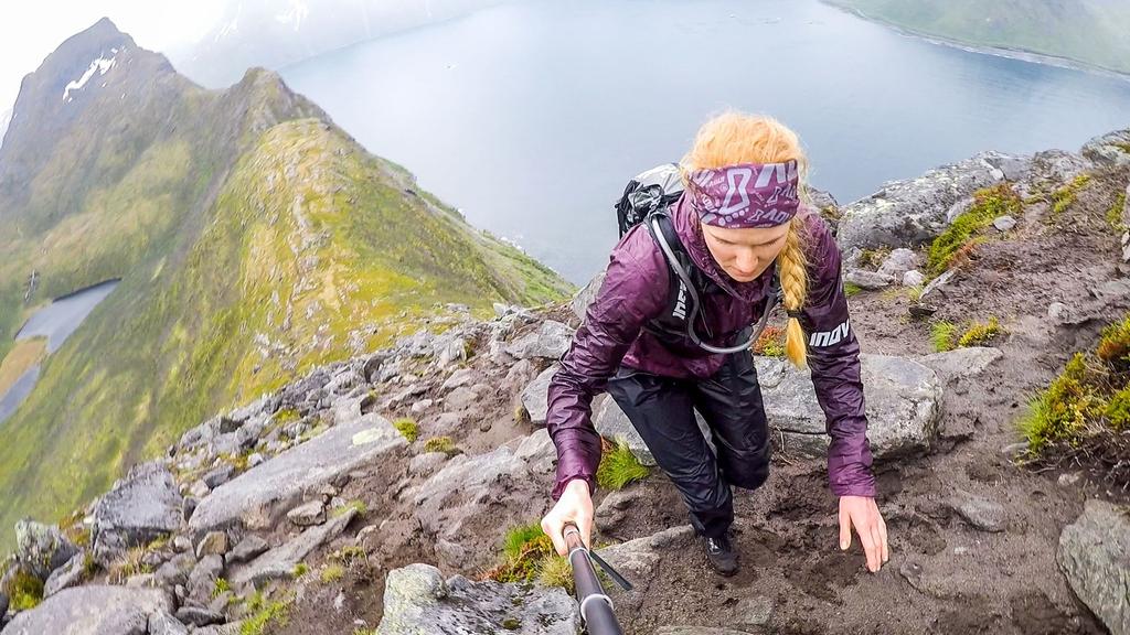 Stien opp var gjørmete og glatt og bar preg av at noen hundre løpere og turgåere allerede hadde passert. Men det var ikke noe problem. Enda. Det var først da vi begynte på det virkelig bratte partiet opp mot toppen av Segla at det begynte å gå opp for meg at dette kom til å bli skikkelig hardt. Det brant i baken, lårene fikk virkelig jobbe, men det gjorde egentlig ingen ting, det som derimot etter hvert gjorde at jeg hadde mest lyst til å begynne å gråte var at det gikk opp for meg at jeg var nødt til å løpe ned igjen samme vei. Og det var bratt, og det var glatt og det var store steiner som løsnet. Nordlendingene var godt rutinert og ropte ut «stein» da de ble vare på steinene som fløy nedover bakken. Frykten min for nedover turen ble ytterligere forsterket da de første gutta løp nedover og mange av dem falt flere ganger. Det så ikke behagelig ut og selv en del av de tøffeste gutta tok det med ro noen av partiene. Jeg kom til toppen og begynte på nedstigningen. Jeg hadde bestemt meg for å ta det pent og rolig ned, klatre baklengs om jeg måtte. For om du ikke har vært på Segla før så kan jeg fortelle deg at om du skulle være så uheldig å skli utfor så har du sånn ca 600 meter rett ned i havet foran deg.