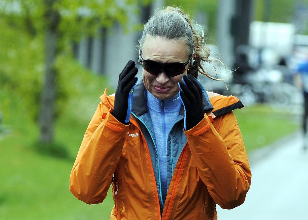 Påklistret smil på vei mot mål, prøver å kamuflere tårer som presser på. Foto: Jarle Mordal; Sunnmørsposten