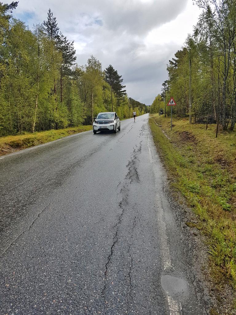 Vinneren av Ålesund maraton i ensom majestet, med egen følgebil. Det er relativt landlig og øde langs ruten, men fint.