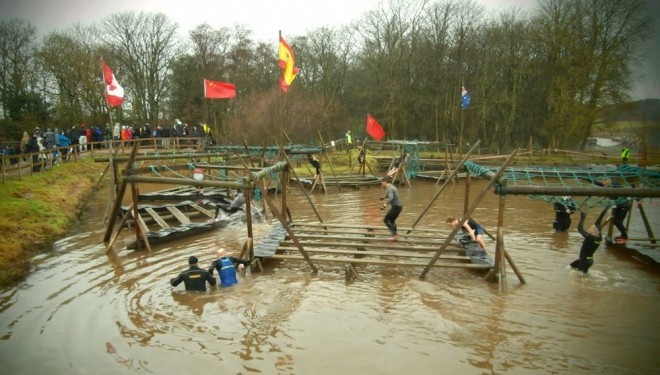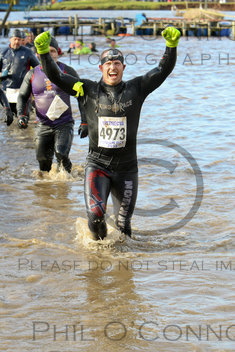 Etter dette vannhinderet fulgte en grusom seanse der vi måtte balansere på et uendelig antall planker over vann og der man enten kunne slenge seg over til neste balansehinder..eller falle i vannet…og jeg fallt mye i vannet…igjen takk gode gud for valg av våtdtrakt og for Supermann som motiverte! Jeg sa 6 km isted ikke sant…så vi måtte innimellom slagene igjen løpe endel…bl a måtte vi gjennom de samme grøftene vi startet med…og var de gjørmete isted, ja så var de «grusomme» nå etter at 5000 mennesker hadde løpt der…ved en glipp sto jeg plutselig med gjørme til livet og brukte sikkert 5 mins på å komme meg løs. Har jeg sagt at det er en fordel å snøre skoene godt…så mange stakkarer som lette etter skoene sine ;) Vi løp også gjennom et langt elveleie der vi løp med vann til midt på leggen…brrrrr kaldt på tærne!