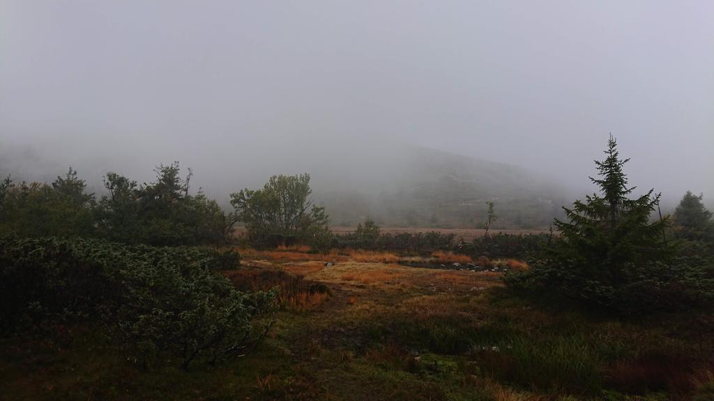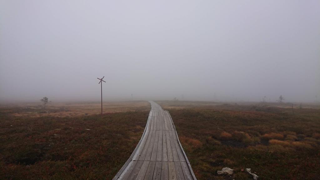 Starten gikk og jeg så at flere jenter løp forbi meg. Jeg hadde bestemt meg for å ikke brenne av kruttet på de første 300 meterne som jeg alltid klarer å gjøre, foran meg hadde jeg en lang bakke som ville kreve sitt og jeg satset på å ta igjen folk på vei oppover. Det gjorde jeg også. Det tok ikke lang tid før jeg tok ledelsen og da jeg nådde toppen av den over 1 kilometer lange bakken hadde jeg fått et godt forsprang. Så ventet det en lang og lettløpt strekning på grusvei og planker og bare rett frem og nedover. Altså ikke det jeg er best på. Jeg visste at jeg måtte holde tempoet oppe, for det er som regel på disse strekningene de jeg har løpt forbi i oppoverbakkene tar meg igjen. Det var vanskelig å se hvor langt bak løper nummer to var, for sikten var dårlig. Plankestien så ut til å ende i ingenting og jeg fikk følelsen av å være helt alene oppe på fjellet, midt i tåka og med vind som dekket over alle andre lyder. Nå hadde det begynt å regne også og det var skikkelig motvind der jeg løp over myren som jeg vet er utrolig vakker. Jeg så ingen andre mennesker, hverken foran meg eller bak meg og jeg siden alt jeg så var hvit tåke var det bare klokken min som ga meg en pekepinn på hvor langt jeg hadde løpt og hvor langt jeg hadde igjen.