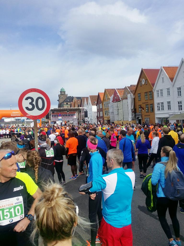 Bergen er uimotståelilg i slikt vær. Første pulje i halvmaraton står klar.