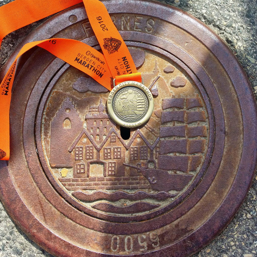 Bergen City Maraton (BCM) har på få år klart å bli Norges fjerde største løpsarrangement med over 10.000 deltagere og distanser for alle og enhver. Jeg er fra Bergen, men bor i Ålesund og tenkte at det kunne være en fin anledning å besøke familie samtidig som jeg kunne løpe en halvmaraton i hjembyen. Det bygges stadig nytt i Bergen, derfor var det interessant å få en løpende sightseeing runde rundt byen. Traseen går gjennom alle fine og kjente steder rundt bykjernen. Vi ble velsignet med perfekt løpevær; delvis skyet, lite vind og akkurat passe temperatur. Arrangementet fremsto som godt planlagt og organisert. For meg som deltaker virket alt veldig bra. Jeg var mindre nervøs denne gangen i fht for to uker siden da jeg løp det lokale Valderløpet, av en eller annen grunn. Fikk litt avstand til presset ved å løpe i en annen by og løpe med ukjente. BCM har en relativt tøff løype med totalt 385 høydemeter, noe jeg så på som utfordrende og som en potensiell hindring i fht å bedre min halvmaratontid. Pga bakkene ville jeg se på løpet som en treningsøkt før Ecotrail Oslo, for å fjerne noe av mitt eget press…. Liksom!