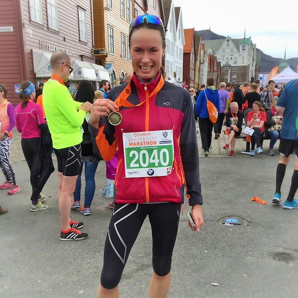 Jeg planla ekstra energiinntak etter 10 km og ved 17 km. Drikke ved hver drikkestasjon, prestere etter terrenget; roe tempoet litt oppover og speede på nedover, ellers prøve å holde oppe stegfrekvensen på 182 steg i minuttet, holdt styr på av en metronomapp, min personlige slavedriver. Ved hjelp av metronomen går jeg inn i en boble, det eneste jeg skal tenke på er å klare å løpe etter takten. Det gikk ikke alltid, men den hjalp meg på mange strekninger. Jeg endte opp med en gjennomsnittlig stegfrekvens på 179 steg. Hvorfor 182 var fordi at jeg hadde testet ut at den frekvensen ga meg akkurat den hastigheten jeg trengte for å klare å forbedre tiden min. Løpsopplevelsen denne gangen var god. Jeg hadde ingen store psykiske knekker underveis, bare litt krampe i noen tær mot slutten og et lite gnagsår (relativt nye sko), jeg klarte å glede meg over vær og omgivelser, folk som heiet og at formen føltes bra, hadde til og med litt igjen da jeg kom i mål og ble møtt av min mor, som fikk oppleve godene og alt livet rundt det å ha gjennomført et løp. Bergen City Maraton greide å skape en skikkelig folkefest med de fineste kulisser rundt arrangementet, start og mål på Bryggen. Det skal ikke forundre meg om de klatrer enda høyere opp på listen i antall deltakere allerede neste år.