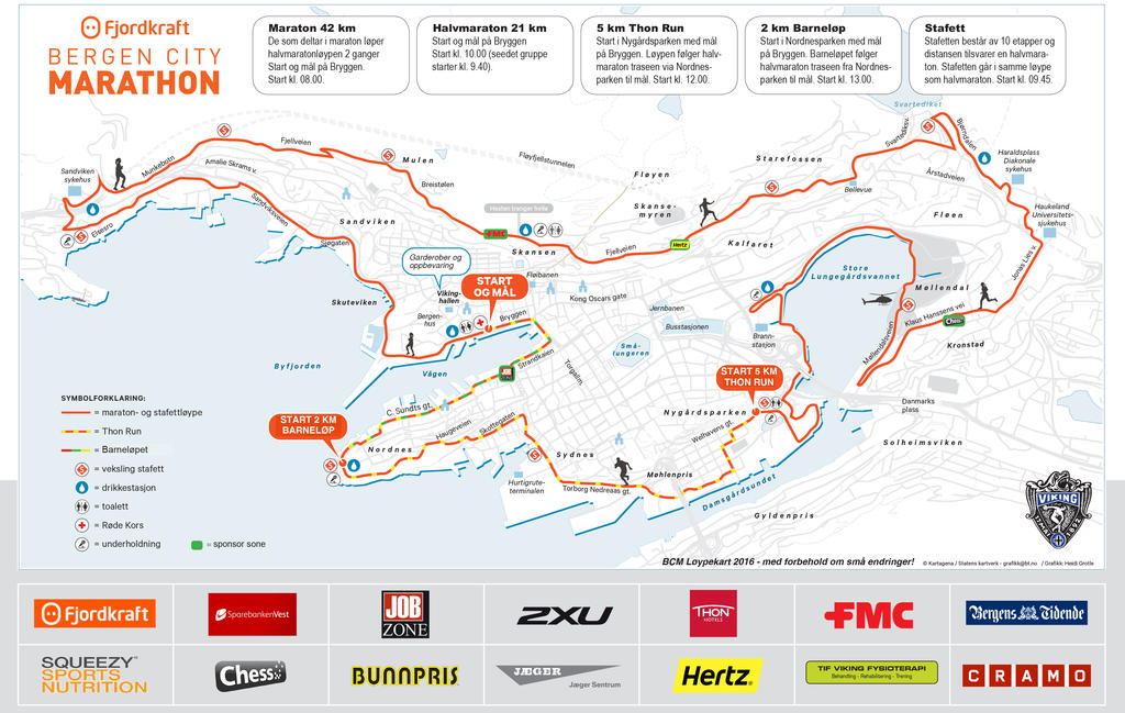Løypekartet. Helmaratonløperne må gjennom traseen to ganger. Man får med seg det som er verdt å få med seg på denne ruten; Bryggen, Gamle Bergen, Fjellveien, demningen ved Svartediket, sykehusene(!), Store lungegårdsvann, Nygårdsparken, de idylliske stedene på Nordnes og Nordnesparken og hele vågen på vei til mål.