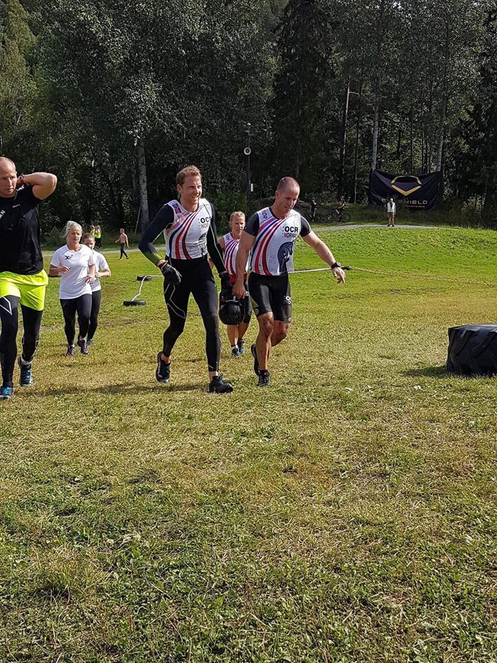 Vi hadde fordelt de tyngste hindrene, kettlebellbæring ble Supermann sin oppgave, Tore og jeg flippet dekk – Supermann kom seg opp skråtaket og fikk dratt opp hu med sirup i ræva. Så bar det over til Purkehenget (digger det hinderet), og der var det bare å hoppe opp og holde seg fast, for nå gikk toget! Ruben og Jørgen lå seff nå foran oss i løypa, men vi beit oss fast og var ikke så himla langt bak de – heldigvis har jeg min styrke på hindrene, og klarer de fleste fort og greit på egen hånd. Løpingen bar nå ut i skogen, og det var digg å kjenne at kroppen faktisk fløyt greit. På tross av mange konkurranser på rad, sliten kropp og hodet – gikk det unna og jeg fikk bare godord bak fra. Det var god stemning på laget.