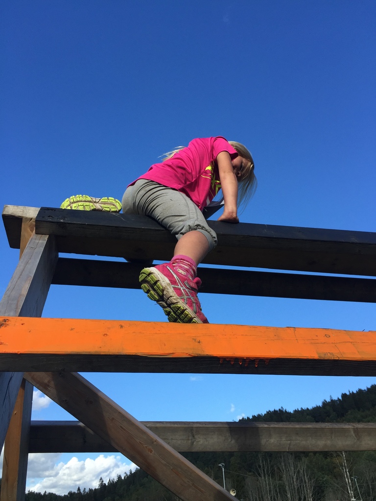 – Superkomboen Monkeybar-balanse-vegg. Et av de virkelig faste til X-run. Dette hinderet har vært med fra begynnelsen, og jeg bare elsker det. For det første holder X-run i motsetning til alle andre, seg til treverk på monkeybaren, det gjør at det faktisk er mulig å få tak her. I tillegg er stengene litt tynnere, slik at også jentefingre klarer å holde seg fast…ja til og med små barnefingre: