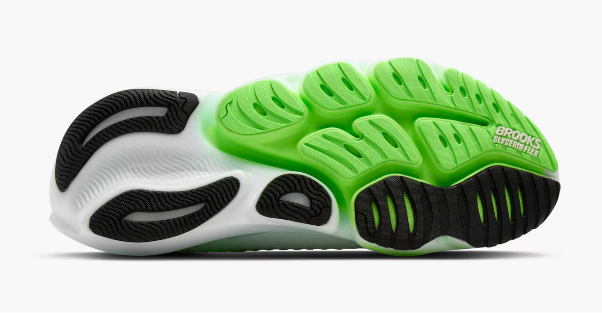 Det mest iøynefallende med Glycerin Flex er hvordan sålen er konstruert for å bøye seg med foten. En asymmetrisk fleksrille gjennom mellomfoten, kombinert med separate fleksible soner i forfoten, gir en jevn og kontrollert overgang gjennom hele steget.