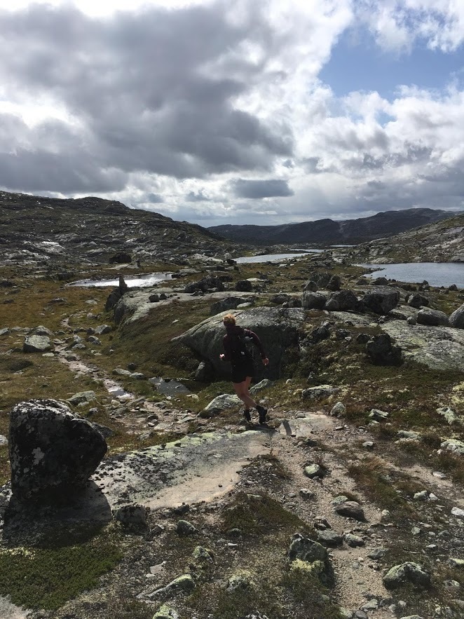 Da vi gikk av fergen på fastlandet møtte vi på Steffen som løp Icebug Xperience ultra 50 miles (eller litt over 80km på norsk). Steffen lå som nummer 1, ( og obs, spoiler: han vant også løpet), av ultraløperne og var den første av mange blide, slitne, tøffe og trivelige ultraløpere vi skulle møte videre på ferden. For herifra fulgte vi samme trase som ultraløperne, bare motsatt vei. Du skulle kanskje tro at det ville føre til trangt om plassen på stiene? Men nei, det var over hode ikke noe problem. Det har vel noe å gjøre med at det er så stor spredning på sånne lange ultraløp at det var langt mellom hver ultraløper. Og hver gang man møtte på en av ultraløperne som kom i motsatt retning fikk man en fin mulighet til å heie litt og gi en high five. Og du, har du prøvd det noen gang? Å gi high five til andre løpere? Det er få ting som gir så effektiv positiv energi påfyll som løper high fives! Not kidding. Så jeg fikk fylt positiv energi banken min til topps denne dagen.